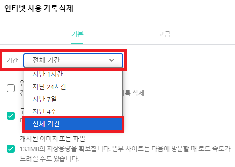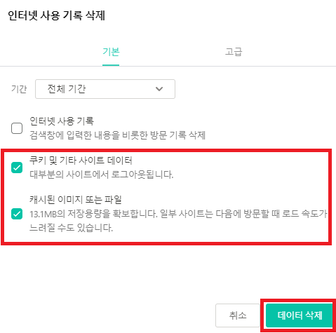 3. "쿠키 및 기타 사이트 데이터", "캐시된 이미지 및 파일" 체크 후 삭제
