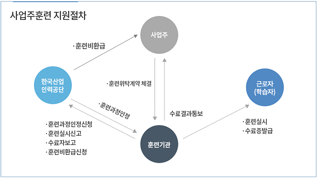 사업주가 고용하고 있는 근로자를 훈련기관에 위탁하여 훈련을 실시하는 경우 소정의 훈련비용을 사업주에게 지원하는 과정입니다.